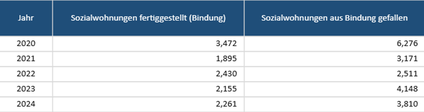 Dass das Argument nicht aus der Luft gegriffen ist, zeigt die nachfolgende Tabelle der neuen Sozialwohnung und derjenigen, die aus der Mietpreisbindung herausgefallen sind:
